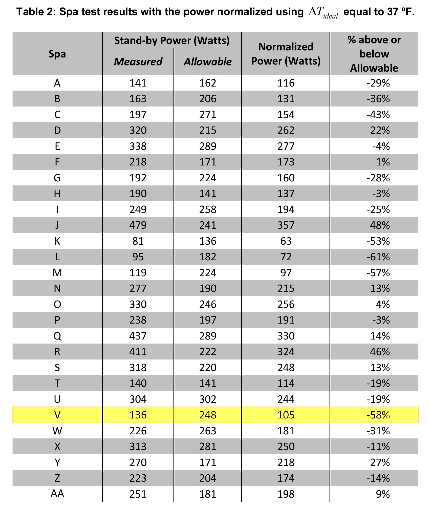 manufacturers of different brands. All 27 spas were tested by: Andrew J. Kean, Ph.D., Glen E. Thorncroft, Ph.D. and Andrew I. Hamill, Mechanical Engineer. The test was performed at California Polytechnic University, San Luis Obispo for compliance to Title 20 as required by the California Energy Commission (C.E.C.). Click the Energy Report to see final and full report. <Click to view Energy Test Report or Right-Click to Save Report> The test results were identified by letters in the report and not by manufacturer or product name. Each spa manufacturer knows the letter designated for their spa. The standard spa identified by letter "V" in the report was tested using our patented spa control, patented heater, patented manifold, and patented spa pump cooling system. The results were 58% below the allowed daily energy usage as defined by the C.E.C. (see Table 2, Page 6 of Test Report). NOTE: Spas identified by "K", "L", and "M" in the report were the only tubs presented and tested without electric heaters. |