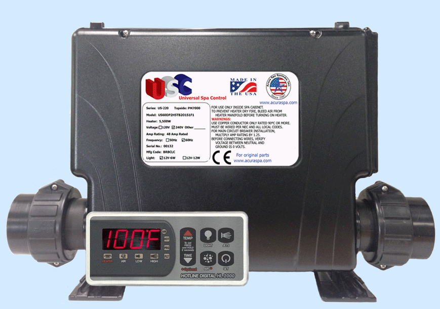 The Universal Spa Control (USC) for $299.00 is a reliable spa control that fits all hot tubs and is a direct replacement for all spa brands. The USC spa pack is equipped with a 5500W (5.5kW), 4000W (4kW), or 3000W (3kW) spa heater. The USC hot tub heater is protected by a reliable pressure switch and two digital temperature sensors. Consumers can easily add to their existing spa plumbing our patented Automatic Air Bleeder to 100% protect the USC spa heater from dry fire. The USC hot tub pack is also equipped with a heavy duty contactor outside of the digital control board to drive the USC spa heater. All of our spa digital control boards are conformably coated to protect the electronic circuitry against the moisture inside portable spa cabinets. Our digital spa circuit boards are 100% made in the USA. Our USC control board can operate up to 4 water pumps and our smart touch spa side controller is made with reliable membrane switch technology used for years in the aerospace industry. Our energy efficient digital spa controller turns the heater on only when necessary, thus saving hot tub owners hundreds of dollars per year on their electrical bill. In addition, our digital spa controller contains Freeze Guard to prevent your hot tub freezing and costing thousands in repairs. We also incorporate Hi-Limit Sensor to protect your spa from overheating (and saving your pumps and plumbing). The Universal Spa Control can power spas and hot tubs all over the world with 120V, 60Hz and 240V, 50Hz single or three phase power. From $324.95, replace all Balboa spa controls, even the balboa hot tub control with M7 technology. If your hot tub is powered by a Balboa water Group heater, call us we can make you a replacement. Some spa manufactures use Gecko spa controls or even Spa Builders controls, call us for a replacement. We offer direct replacement to all controls made by ACC spa packs also known as Applied Computer Controls, smart touch 1000, smart touch 1500 or smart touch 2000.We can build equivalent heater to United Spas controls, Waterway digital controls are using the same polymer enclosure as the USC. We can also make you a control to replace Brett Aqualine and Catalina controls or Even CRL spa pack. spa manufacturers do not make controls or hetaer they purchase them from spa pack mfg. is any of the following spa manufacture, the USC can power and control your hot tub. Alp Spas, Affordable Spas, Action Spas, Hot Spring Spas, Sundance Spas, Vita Spas, Maax Spas, Saratoga Spas, Clear Water Spas, Caldera Spas, LA Spas, Dolphin Spas, Diamante spas, Sensation Spas, PDC Spas, Hawkeye Spas, Morgan Spas, US Spas, Cal Spas, Advanced Spa Designs, Thermospas, Aquamonde Spas, Aquamonde Hot Tub, Free Flow Spas, Viking Spas, Sweetwater Spas, Aspen Spas, Nordic Spas, Apollo Spas, United Spas, Life Spas, True Force Spas, Country Leisure Manufacturing, Catalina Spas, Caribbean Spas, Curtis Spas, Hydro Spas, Spa Manufacturers, Atlas Spa, Pacific Marquis, Beachcomber, Aris Spas, Tuff Spas, Sun Ray Spas, Leisure Bay Spas, Master Spas, Blue Ridge by Jacuzzi, South West Industries, BullFrog Spas, Sunset Spas, Paradise Spas, Turbo spas, Spa and Tub Manufacturer, Sunquest Spas, Spa Crest, Spas by Design, Spa Plus, QCA Spas, South Pacific Spas, Anton Spas, Charisma Spas, Sunrise Spas, Bahamas Spas, Santa Barbara Spas, Safari Spas, Bradford Spas, US Spas, Four Wind Spas, Millennium Spas, Seaside Spas, Icon Spas, Keys Backyards, Hot Tub Factory, Gulf Cost Spas, Gatsby spas, Emerald Spas, Blue Falls Mfg, Aber Hot Tubs, Aqua Mystique Spas, Aqua 4 Fun Spas, Aquamarine Spas, Tiger River Spas, Aquatique Industries, Australian Spas, Baja Spas, Blue Water Spas, Classic Spas, Clipper Spa Manufacturer, Clear Water Spas, Caldera Spas, Watking Spa Manufacture, Hot Spring Spas, Royal Spas, La-Z-Boy Spas, Fort Wayne Spas, Esther William Spas, Coast Spas, Water Edge Spas, Cal Spas, Cal Spa, Rio Swim Spas, Diamond Back Spas, Pacific Pool and Spas, Artesian Spas, Izzi Manufactuing, Jacuzzi, Seven Seas Spa, Monalisa Spas, California Cooperage Spas, Coleman Spas, Caldera Spas, Swim Spa Manufacturers, Strong Spas, Aries Spas, Artic Spas, Roberts Hot Tub, Alp Spas/Associated Leisure Products, Bullfrog Spas, Carribbean Spas, Country Leisure Spas, Curtis Spas, D. M. Industries, Dakota Spas, Diamonte Spas/Sensation Spas, Dimension One Spas, Dolphin Spas, Goodlife Spas, Grecian Spas, Hawkeye Spas, Islander Spas, ITT Industries/HydroAir (Europe), Jetpool (Brazil), Leisure Spas/Sedona Spas, Life Spas, Lifespring Spas, Marathon Spas, Mountain Springs Spas, Orozco International Spas, Pacific Fiberglass, Pacific Pool and Spas (Canada), Phoenix Spas, Platinum Spas, Seacard Pool and Spas, Sequoia Spas, Sunbelt Spas, Sunquest, ThermoSpas, US Tooling Spas, United Super Spas, Vortex Whirlpool Systems, Inc. and many others. Spa manufacture submit their spas for testing under UL standard 1563 for US, CSA for Canada and CE for Europe.