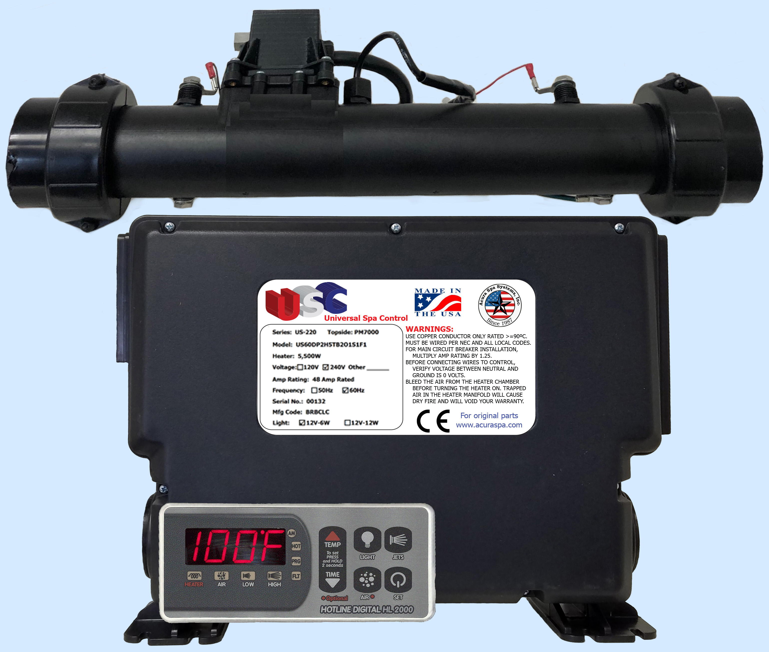 The Universal Spa Control (USC) for $299.00 is a reliable spa control that fits all hot tubs and is a direct replacement for all spa brands. The USC spa pack is equipped with a 5500W (5.5kW), 4000W (4kW), or 3000W (3kW) spa heater. The USC hot tub heater is protected by a reliable pressure switch and two digital temperature sensors. Consumers can easily add to their existing spa plumbing our patented Automatic Air Bleeder to 100% protect the USC spa heater from dry fire. The USC hot tub pack is also equipped with a heavy duty contactor outside of the digital control board to drive the USC spa heater. All of our spa digital control boards are conformably coated to protect the electronic circuitry against the moisture inside portable spa cabinets. Our digital spa circuit boards are 100% made in the USA. Our USC control board can operate up to 4 water pumps and our smart touch spa side controller is made with reliable membrane switch technology used for years in the aerospace industry. Our energy efficient digital spa controller turns the heater on only when necessary, thus saving hot tub owners hundreds of dollars per year on their electrical bill. In addition, our digital spa controller contains Freeze Guard to prevent your hot tub freezing and costing thousands in repairs. We also incorporate Hi-Limit Sensor to protect your spa from overheating (and saving your pumps and plumbing). The Universal Spa Control can power spas and hot tubs all over the world with 120V, 60Hz and 240V, 50Hz single or three phase power. From $324.95, replace all Balboa spa controls, even the balboa hot tub control with M7 technology. If your hot tub is powered by a Balboa water Group heater, call us we can make you a replacement. Some spa manufactures use Gecko spa controls or even Spa Builders controls, call us for a replacement. We offer direct replacement to all controls made by ACC spa packs also known as Applied Computer Controls, smart touch 1000, smart touch 1500 or smart touch 2000.We can build equivalent heater to United Spas controls, Waterway digital controls are using the same polymer enclosure as the USC. We can also make you a control to replace Brett Aqualine and Catalina controls or Even CRL spa pack. spa manufacturers do not make controls or hetaer they purchase them from spa pack mfg. is any of the following spa manufacture, the USC can power and control your hot tub. Alp Spas, Affordable Spas, Action Spas, Hot Spring Spas, Sundance Spas, Vita Spas, Maax Spas, Saratoga Spas, Clear Water Spas, Caldera Spas, LA Spas, Dolphin Spas, Diamante spas, Sensation Spas, PDC Spas, Hawkeye Spas, Morgan Spas, US Spas, Cal Spas, Advanced Spa Designs, Thermospas, Aquamonde Spas, Aquamonde Hot Tub, Free Flow Spas, Viking Spas, Sweetwater Spas, Aspen Spas, Nordic Spas, Apollo Spas, United Spas, Life Spas, True Force Spas, Country Leisure Manufacturing, Catalina Spas, Caribbean Spas, Curtis Spas, Hydro Spas, Spa Manufacturers, Atlas Spa, Pacific Marquis, Beachcomber, Aris Spas, Tuff Spas, Sun Ray Spas, Leisure Bay Spas, Master Spas, Blue Ridge by Jacuzzi, South West Industries, BullFrog Spas, Sunset Spas, Paradise Spas, Turbo spas, Spa and Tub Manufacturer, Sunquest Spas, Spa Crest, Spas by Design, Spa Plus, QCA Spas, South Pacific Spas, Anton Spas, Charisma Spas, Sunrise Spas, Bahamas Spas, Santa Barbara Spas, Safari Spas, Bradford Spas, US Spas, Four Wind Spas, Millennium Spas, Seaside Spas, Icon Spas, Keys Backyards, Hot Tub Factory, Gulf Cost Spas, Gatsby spas, Emerald Spas, Blue Falls Mfg, Aber Hot Tubs, Aqua Mystique Spas, Aqua 4 Fun Spas, Aquamarine Spas, Tiger River Spas, Aquatique Industries, Australian Spas, Baja Spas, Blue Water Spas, Classic Spas, Clipper Spa Manufacturer, Clear Water Spas, Caldera Spas, Watking Spa Manufacture, Hot Spring Spas, Royal Spas, La-Z-Boy Spas, Fort Wayne Spas, Esther William Spas, Coast Spas, Water Edge Spas, Cal Spas, Cal Spa, Rio Swim Spas, Diamond Back Spas, Pacific Pool and Spas, Artesian Spas, Izzi Manufactuing, Jacuzzi, Seven Seas Spa, Monalisa Spas, California Cooperage Spas, Coleman Spas, Caldera Spas, Swim Spa Manufacturers, Strong Spas, Aries Spas, Artic Spas, Roberts Hot Tub, Alp Spas/Associated Leisure Products, Bullfrog Spas, Carribbean Spas, Country Leisure Spas, Curtis Spas, D. M. Industries, Dakota Spas, Diamonte Spas/Sensation Spas, Dimension One Spas, Dolphin Spas, Goodlife Spas, Grecian Spas, Hawkeye Spas, Islander Spas, ITT Industries/HydroAir (Europe), Jetpool (Brazil), Leisure Spas/Sedona Spas, Life Spas, Lifespring Spas, Marathon Spas, Mountain Springs Spas, Orozco International Spas, Pacific Fiberglass, Pacific Pool and Spas (Canada), Phoenix Spas, Platinum Spas, Seacard Pool and Spas, Sequoia Spas, Sunbelt Spas, Sunquest, ThermoSpas, US Tooling Spas, United Super Spas, Vortex Whirlpool Systems, Inc. and many others. Spa manufacture submit their spas for testing under UL standard 1563 for US, CSA for Canada and CE for Europe.